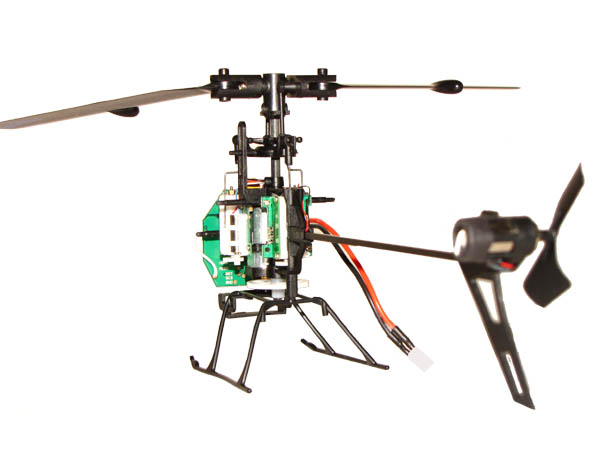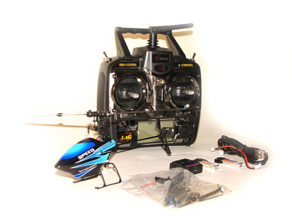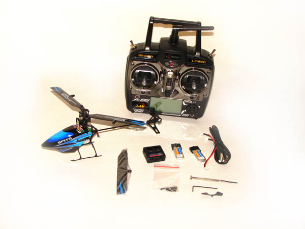 W zestawie znajdują się oczywiście helikopter i radio, a także dwa akumulatory ładowarka z kabelkiem USB oraz dwoma kabelkami do podłączenia akumulatorów, komplet zapasowych piór, zestaw śrubek, zapasowe łączniki i popychacze, oraz zapasowe gumki mocujące kabinę, śmigło tylne, oraz śrubokręt precyzyjny i klucz imbusowy do śrub mocujących śmigła główne.